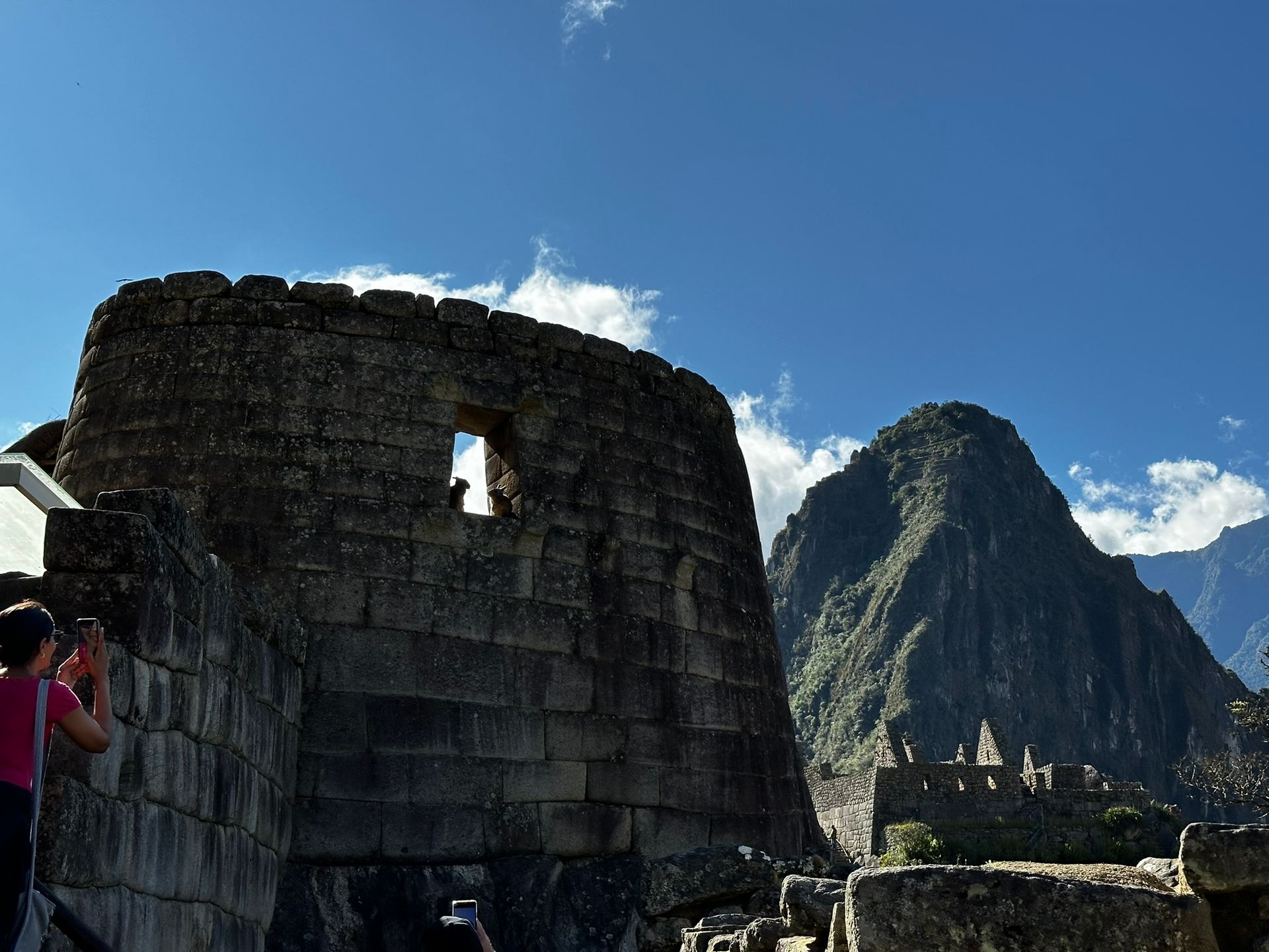 Our tour continued around the Temple of the Sun to enter the central plaza, from where there is a beautiful view of the Temple of the Three Windows and the small pinnacle of land where the sundial or Intihuatana is located. We walked through the enclosures where the inhabitants of the citadel once lived, observing some constructions that had two floors in their time. We came across a stone called the Stone of Mirrors, which might have been used to observe the stars through the reflection of the water on nights of absolute darkness.